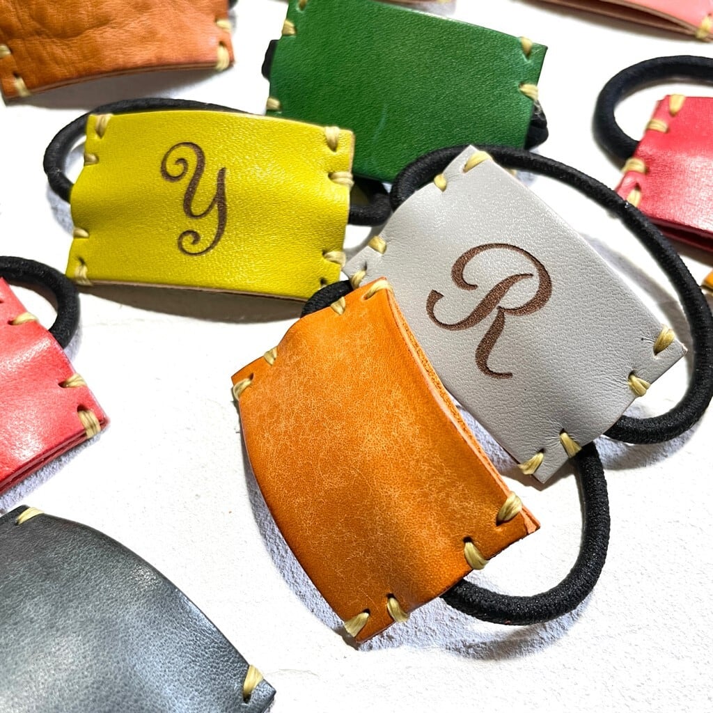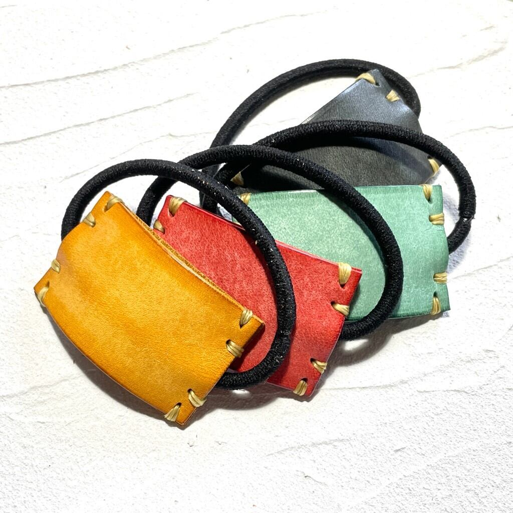 2枚の革でゴムを挟み込んだデザインのヘアゴムになります。